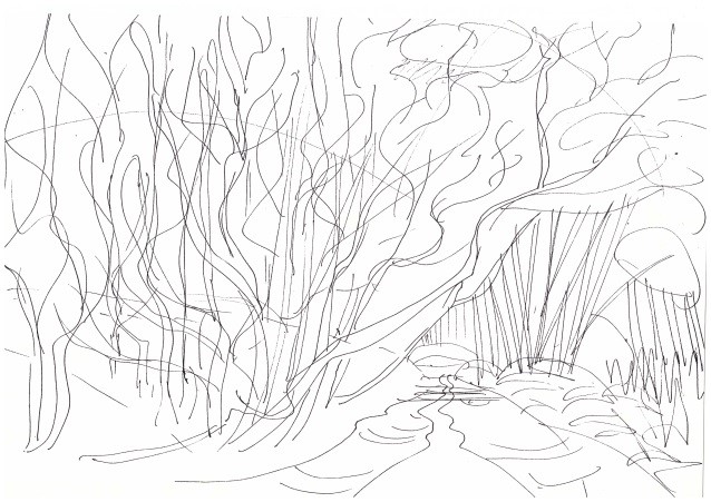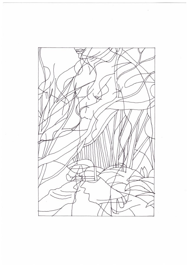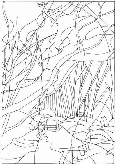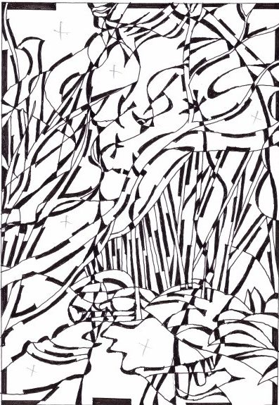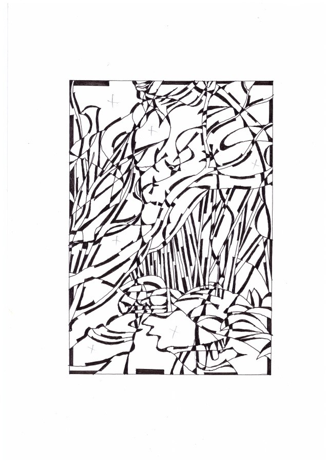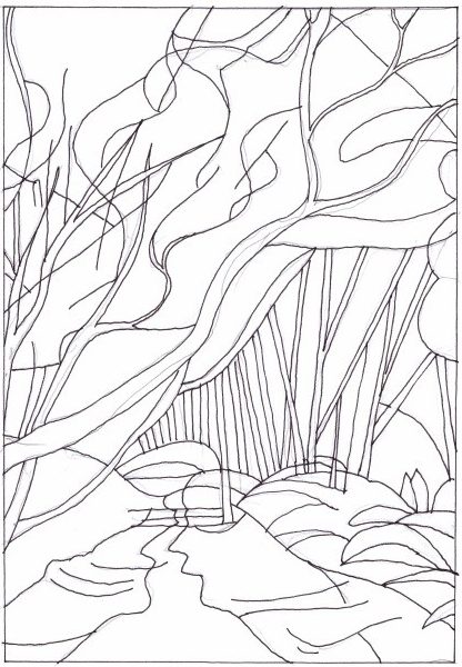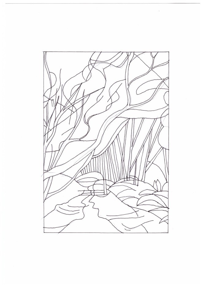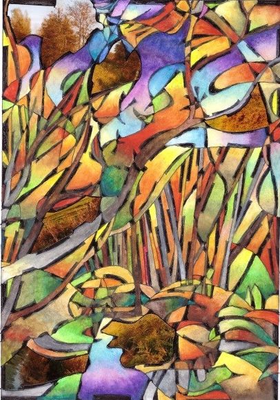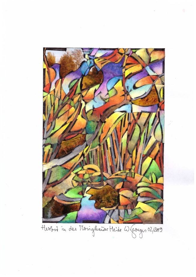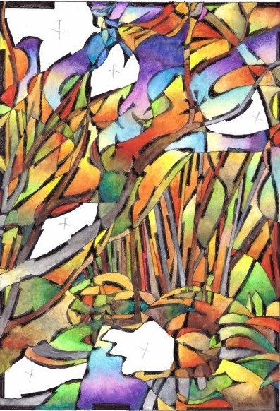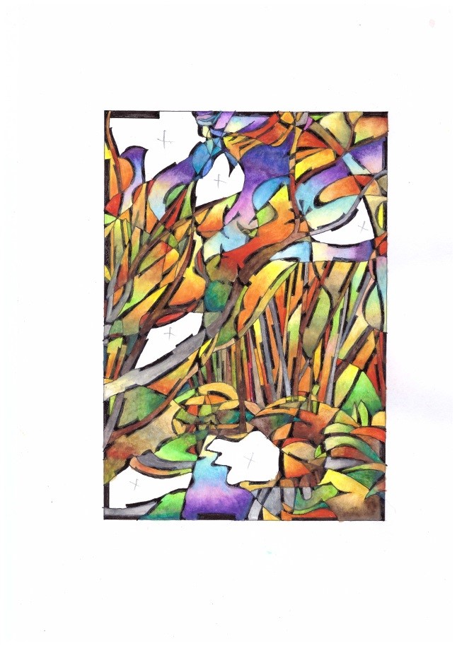 Ich kennzeichne die Flächen, die für die vierte Bildebene frei gehalten werden sollen. Anschließend werden die Flächen in der dritten Bildebene – in diesem Fall mit Hilfe von Aquarellstiften – ausgefüllt. Dabei werden die Flächen, selbst die kleinsten, farbverlaufend ausgefüllt.