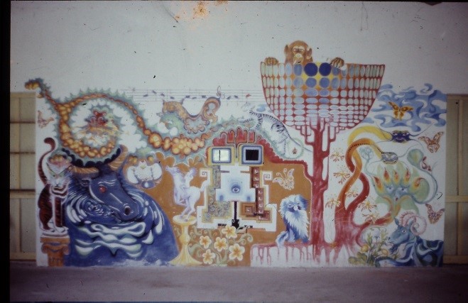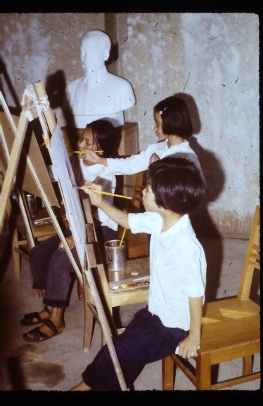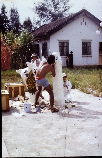 Nebenbei stattete ich unseren „Kinosaal“ mit einem Wandbild aus, gründete mit Gerd einen Malzirkel für vietnamesische Kinder, bemalte den Kollegen die Tropenhelme mit vietnamesischen Motiven und gestaltete mit den Kindern unserer vietnamesischen Mitarbeiter zwei Holzplastiken „Nam và Nu – Mann und Frau“.